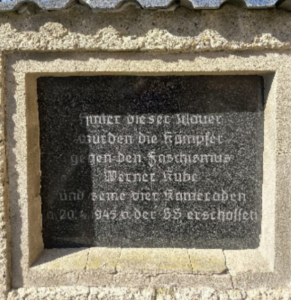 An der gegenüberliegenden Mauer wurden die fünf Kameraden erschossen. In die Mauer eingelassen ist seit 1952 eine Gedenktafel mit der Inschrift: